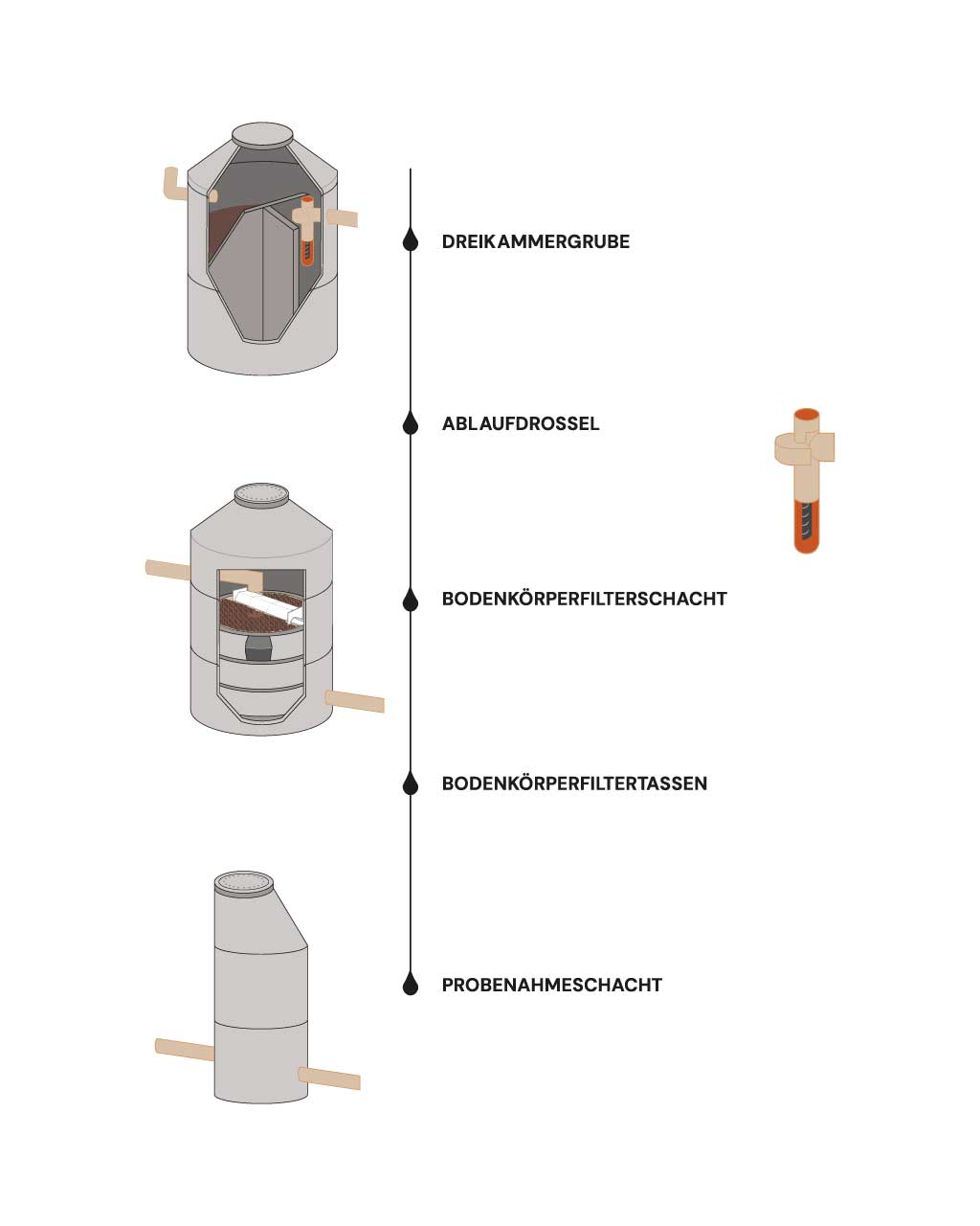 Die AQUATO® Bodenkörperfilteranlage reinigt Abwasser in einem mehrstufigen, natürlichen Prozess ohne externe Energiezufuhr. Das Abwasser fließt zunächst in eine Dreikammergrube zur mechanischen Vorklärung, wo Schwebeteile abgesetzt werden. Eine patentierte Ablaufdrossel sorgt für einen gleichmäßigen Abwasserablauf und hält weitere Schwebeteile zurück. Das vorgeklärte Abwasser gelangt dann in den Bodenkörperfilterschacht, wo es über eine Wippe gleichmäßig auf Bodenkörperfiltertassen verteilt wird. Auf den Bodenkörperfiltertassen angesiedelte Mikroorganismenkulturen bauen die Abwasserschadstoffe ab. Die Belüftung der Mikroorganismen erfolgt passiv über ein Ablaufrohr (DN150), das durch einen Kamineffekt Sauerstoff in den Behälter leitet und so deren einwandfreie Funktion sichert. Der Probenahmeschacht ermöglicht eine einfache Entnahme des gereinigten Wassers.